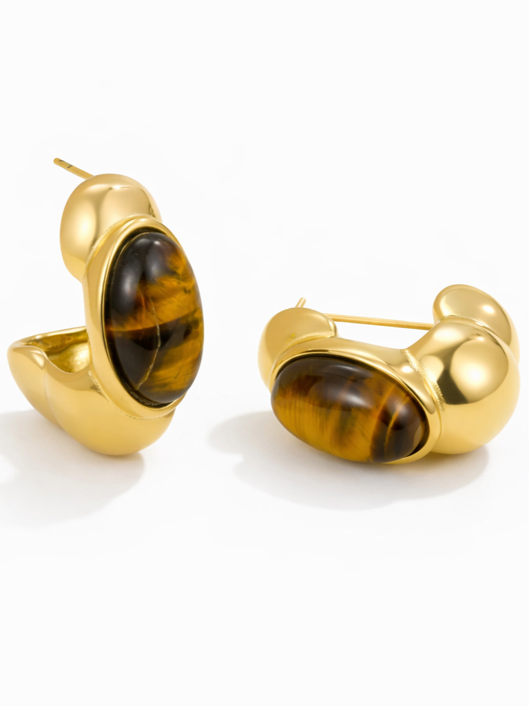 - Bold 18k gold plated huggie earrings featuring natural tiger-eye stone for a powerful, earthy statement look.