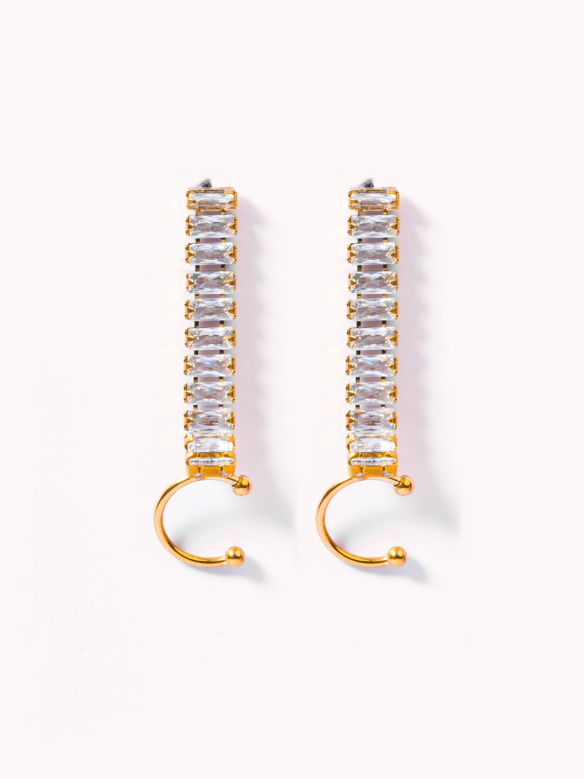- Sleek & Bold Design – White stone earrings with an attached cuff for a modern, statement look.
